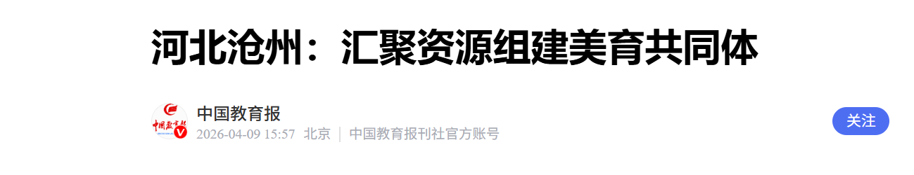 根据计划,2026年,该共同体将聚焦核心目标,重点推进21项美育核心工作,将通过组建跨学段美育教研组、实施师资共育计划、开发沧州特色美育微课程、建设美育实践基地、开展美育资源普查及课题研究等行动,实现美育资源共享、教学共研、师资共育、成果共展,推动区域美育事业高质量发展。共同体秘书处设在沧州幼儿师范高等专科学校,将统筹协调各项工作的落地实施。